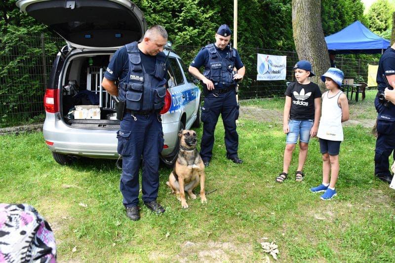 Można było również poznać policyjnego psa, który wraz ze swoim przewodnikiem zaprezentował pokaz tresury oraz posłuszeństwa. Funkcjonariusz przeprowadził pogadankę opowiadając o swojej codziennej służbie oraz uczulał dzieci na różne niebezpieczeństwa wynikające m. in. z ich nieostrożności i lekkomyślnego zachowania wobec zwierząt.