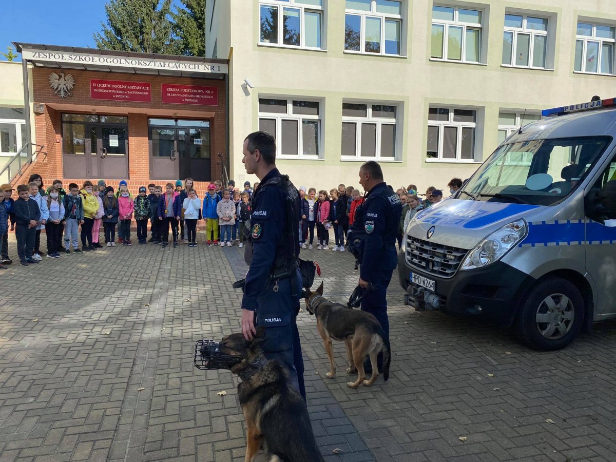 W Szkole Podstawowej w Świdniku zgromadzili się uczniowie klas pierwszych, drugich i trzecich. Dzieci początkowo miały okazję przypomnieć sobie o numerze alarmowym, o zachowaniu się w kontaktach z obcymi ludźmi, zwierzętami, jak bezpiecznie poruszać się na drodze i chodniku oraz jak reagować na agresję rówieśniczą. Następnie dzieci udały się przed szkołę, gdzie czekali na nich przewodnicy ze swoimi psami i przybliżyli uczniom jak wygląda praca z czworonogiem oraz zaprezentowali pokaz posłuszeństwa psa oraz jak wygląda interwencja z użyciem czworonoga.