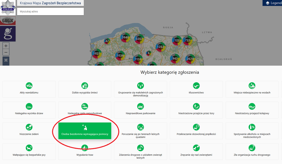Warto również pamiętać, że miejsca, w których przebywają osoby bezdomne wymagające pomocy, można wskazać za pomocą Krajowej Mapy Zagrożeń Bezpieczeństwa. Wśród dostępnych kategorii zgłoszeń znajduje się opcja: „Osoba bezdomna wymagająca pomocy”. Link do KMBZ